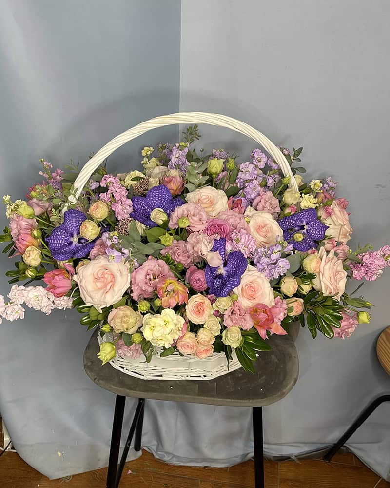 Корзина из микса пастельных цветов- нежное и уникальное решение для подарка близкому человеку.